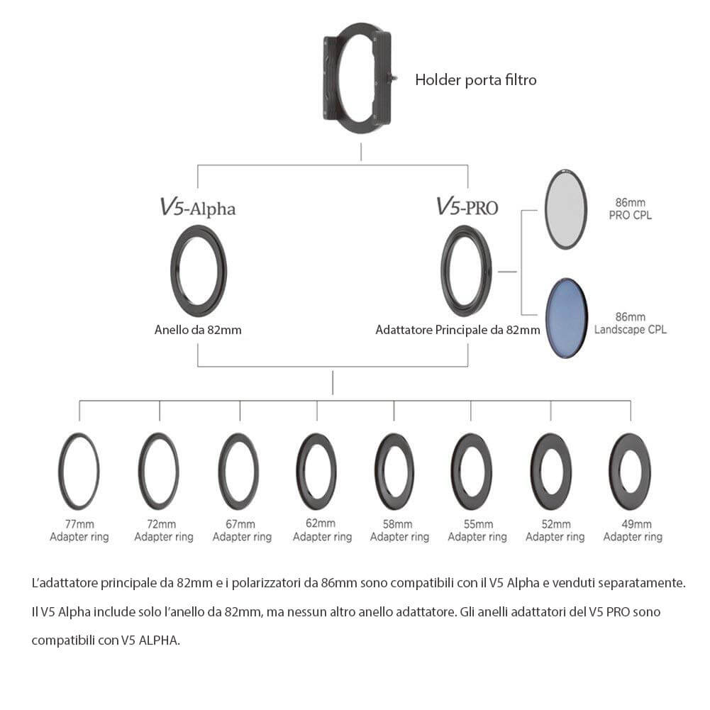 With a similar in design to the V5 Pro, includes a newly designed 82mm adapter ring (not a main 82mm adaptor with CPL rotation). It does NOT include other adapter rings, but is compatible with the rings of the V5 PRO/V6. It does NOT include the polariser and the main ring for the rotation of the CPL but it can be upgraded with the 82mm main ring of the V5 PRO and related customised polarisers.